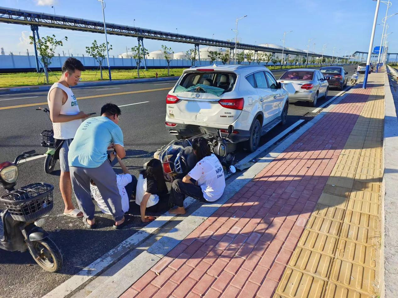 近日,在大南海石化工業(yè)區(qū)環(huán)海南路發(fā)生一起交通事故,兩位年輕人的暖心行為引起了廣泛關注。據了解,7月24日下午15時許,一輛電動摩托車撞上了停放在路邊的小汽車,三位女孩受傷,其中,兩名女孩傷勢嚴重,躺在地上無法動彈。就在這時,兩位年輕人跑了過來,向其中一位傷勢較輕的女孩了解具體情況,對另外兩位女孩子進行安撫陪伴,并聯(lián)系小汽車車主。此時,另一位好心市民也跑過來幫忙,撥打了110和120。兩位年輕人一直陪伴在三位女孩身邊,直至救護車將她們送到醫(yī)院治療才離去。