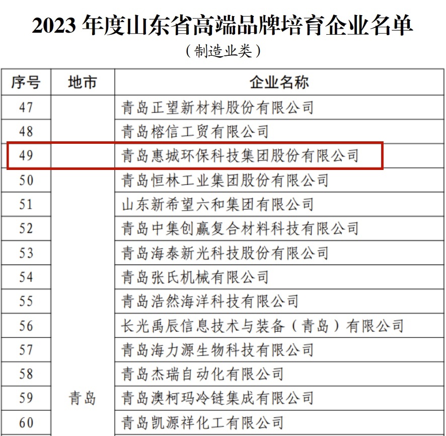 日前,山東省市場監(jiān)督管理局公布了“2023年度山東省高端品牌培育企業(yè)”名單,青島惠城環(huán)??萍技瘓F股份有限公司榜上有名。