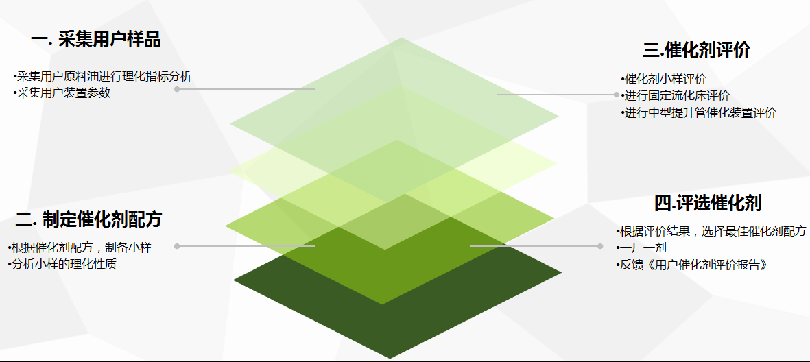 銷售人員負責售前采集客戶生產(chǎn)工藝數(shù)據(jù)、原料油樣品等,然后交由技術(shù)服務中心分析,研發(fā)部根據(jù)分析結(jié)果制備催化劑小樣,通過重油微反實驗裝置、固定流化床實驗裝置和中型提升管催化裂化裝置,對催化劑配方篩選和工藝效果實施三級評價,根據(jù)評價結(jié)果靈活調(diào)整催化劑配方重復試驗并選定最優(yōu)方案交由生產(chǎn)管理部實施定制化生產(chǎn)。