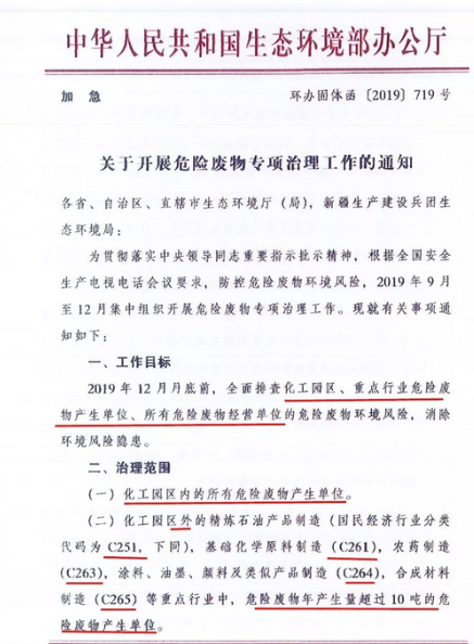 日前生態(tài)環(huán)境部印發(fā)加急文件《關(guān)于開展危險(xiǎn)廢物專項(xiàng)治理工作的通知》。 《通知》要求今年年底前,在全國范圍內(nèi)排查化工園區(qū)、重點(diǎn)行業(yè)危險(xiǎn)廢物產(chǎn)生單位、所有危險(xiǎn)廢物經(jīng)營單位的危險(xiǎn)廢物環(huán)境風(fēng)險(xiǎn),消除環(huán)境風(fēng)險(xiǎn)隱患。[ 查看更多 ]